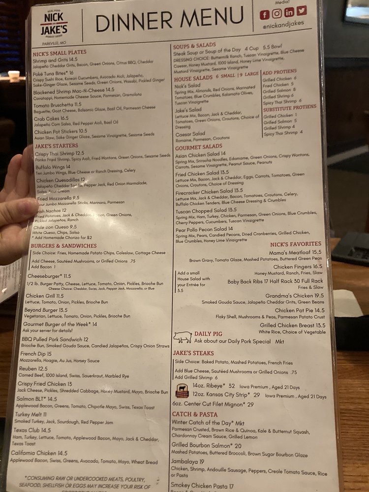 Nick and Jake’s, a beloved American breakfast and brunch spot in Parkville, MO, offers a wide range of options for diners. From takeout and delivery to vegetarian-friendly dishes, the restaurant caters to all preferences with convenience and accessibility in mind. With a menu featuring favorites like the 12oz CAB Kansas City Strip and the Firecracker Chicken Salad, customers rave about the quality and taste of the food. The atmosphere is described as comfortable and not too noisy, providing a pleasant dining experience. Whether enjoying a meal with a large group or unwinding during happy hour, Nick and Jake’s has something for everyone. Be sure to try their decadent chocolate cake for a sweet ending to your meal. Overall, this local gem shines with consistently good and delicious dishes, making it a go-to choice for many diners.